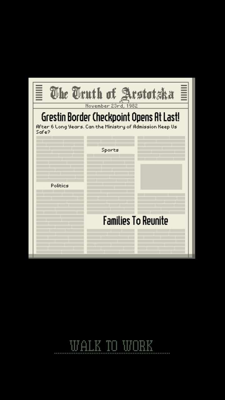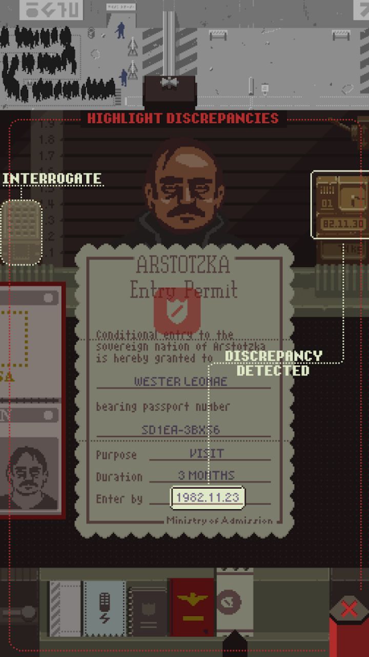 Success in Papers, Please hinges on attention to detail and careful decision-making. As an immigration officer, your goal is to follow the rules and guidelines set by the government while ensuring that no threats slip through. Pay close attention to discrepancies, forgery attempts, and inconsistencies in the documents presented to you.